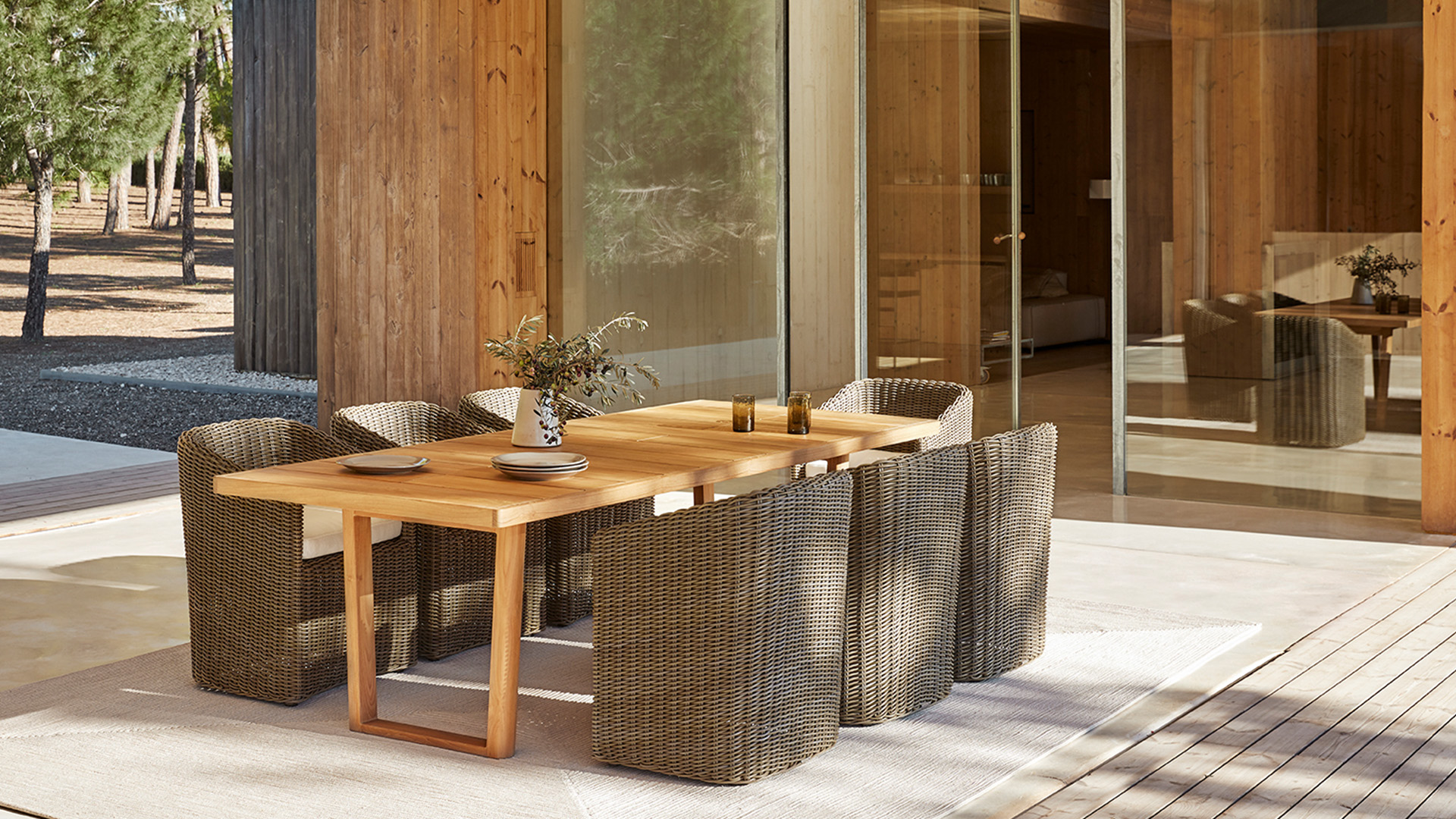 Mesa de comedor rectangular de 260 x 103 centímetros. Estructura de madera de teca de grado A, con certificación FSC, procedente de bosques gestionados de forma sostenible y controlada en Indonesia.