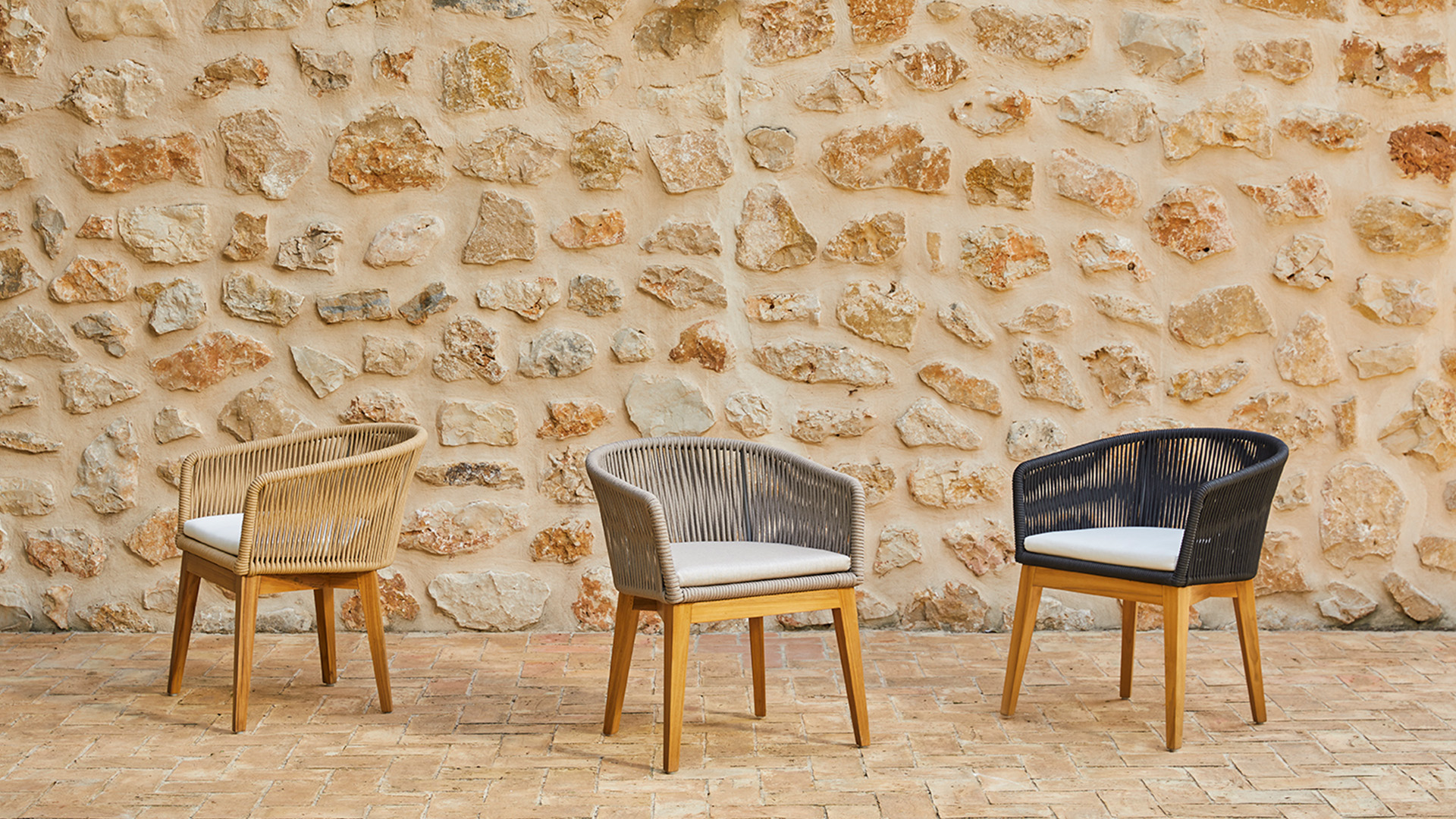 El equipo de POINT Studio buscaba crear una pieza con un marcado estilo mediterráneo. Con su forma escultural, la precisión de su tejido de cuerda, especialmente en la curva del brazo, y la perfección de su acabado artesanal, Khai rebosa personalidad. Este tejido de cuerda, disponible en color turrón, topo y negro, se combina con elementos de madera de teca (procedente de bosques gestionados de forma sostenible).