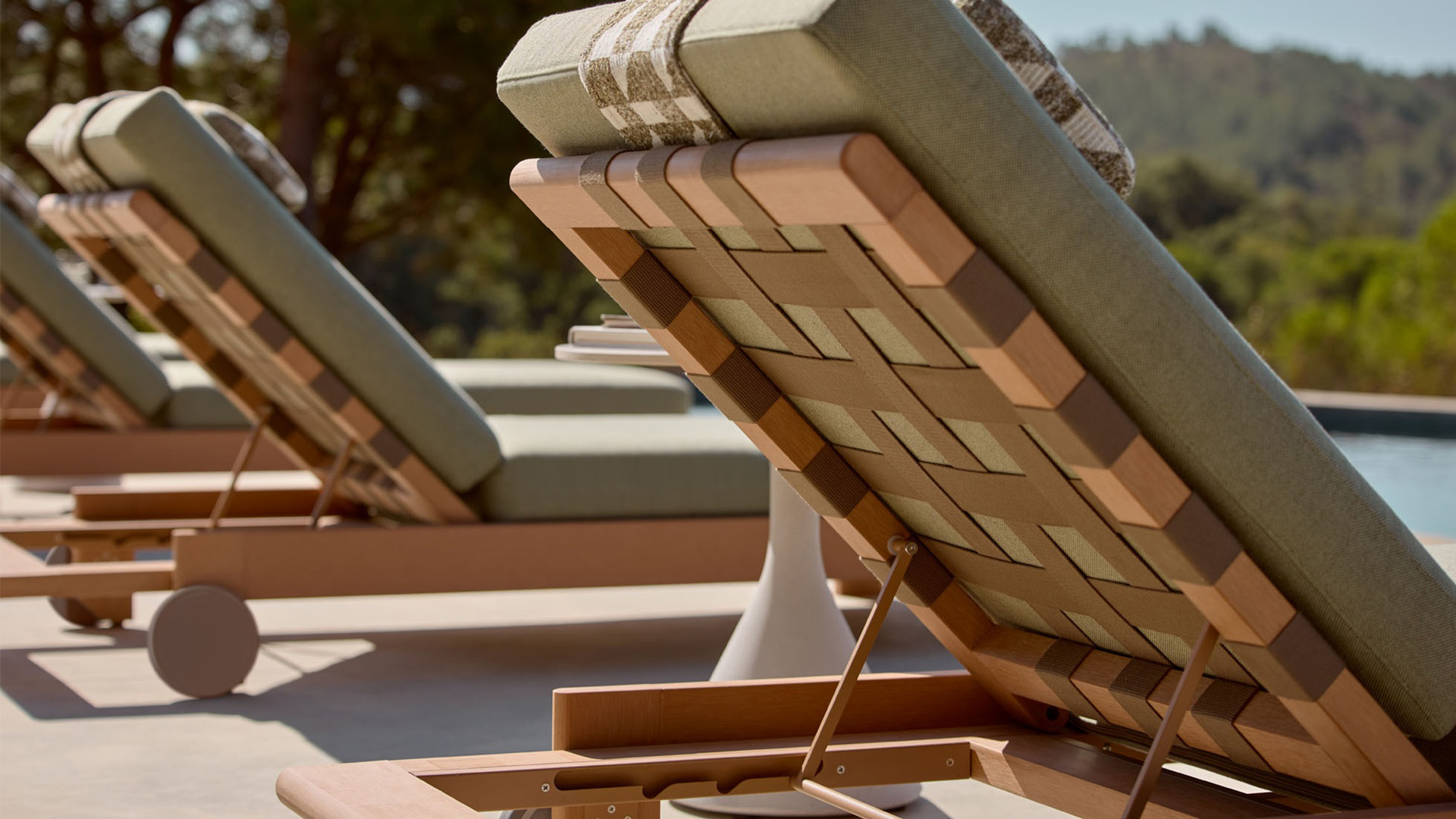 Diseñada para una relajación prolongada, esta tumbona combina líneas depuradas con una funcionalidad precisa. Fabricada en TechTeak®, cuenta con asiento y respaldo de correas planas de poliéster de 6 cm de ancho, que brindan comodidad, flexibilidad y resistencia a la intemperie. Además, incluye un respaldo reclinable y ruedas para facilitar su desplazamiento. El colchón opcional está tapizado en tejido acrílico 100 % teñido en masa con tratamiento antimanchas y antimoho, lo que garantiza comodidad y durabilidad.