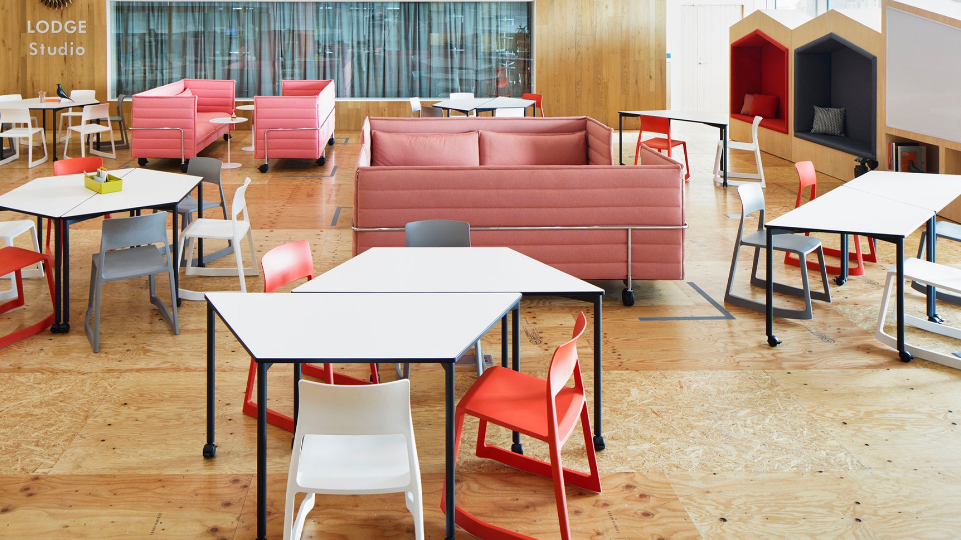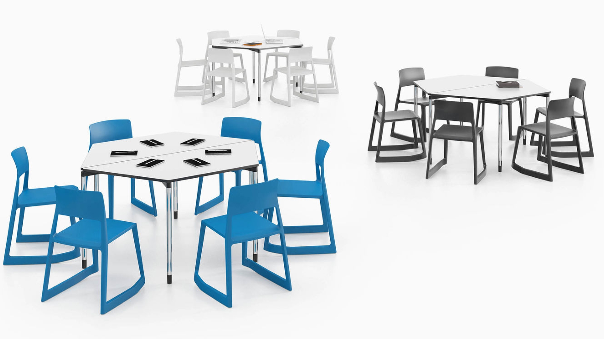 La Map Table, diseñada por Edward Barber y Jay Osgerby, es un sistema de mesas universal. Las mesas pueden reorganizarse y apilarse de forma rápida y sencilla cuando es necesario, lo que las hace ideales para cualquier situación que requiera configuraciones flexibles y un aprovechamiento óptimo del espacio.