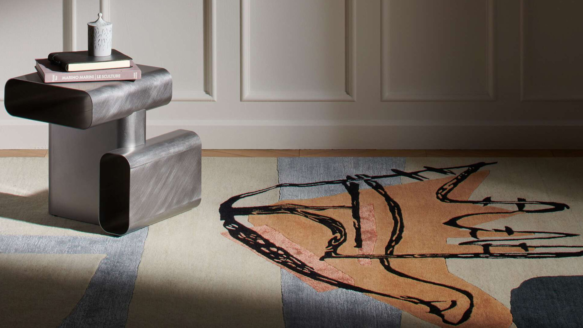 Inspirada en Le Poème de l'Angle Droit, el libro de arte editado en 250 copias que presenta la visión de Le Corbusier sobre la arquitectura, esta alfombra retrata una litografía a siete colores creada en la histórica imprenta parisina Studio Mourlot.