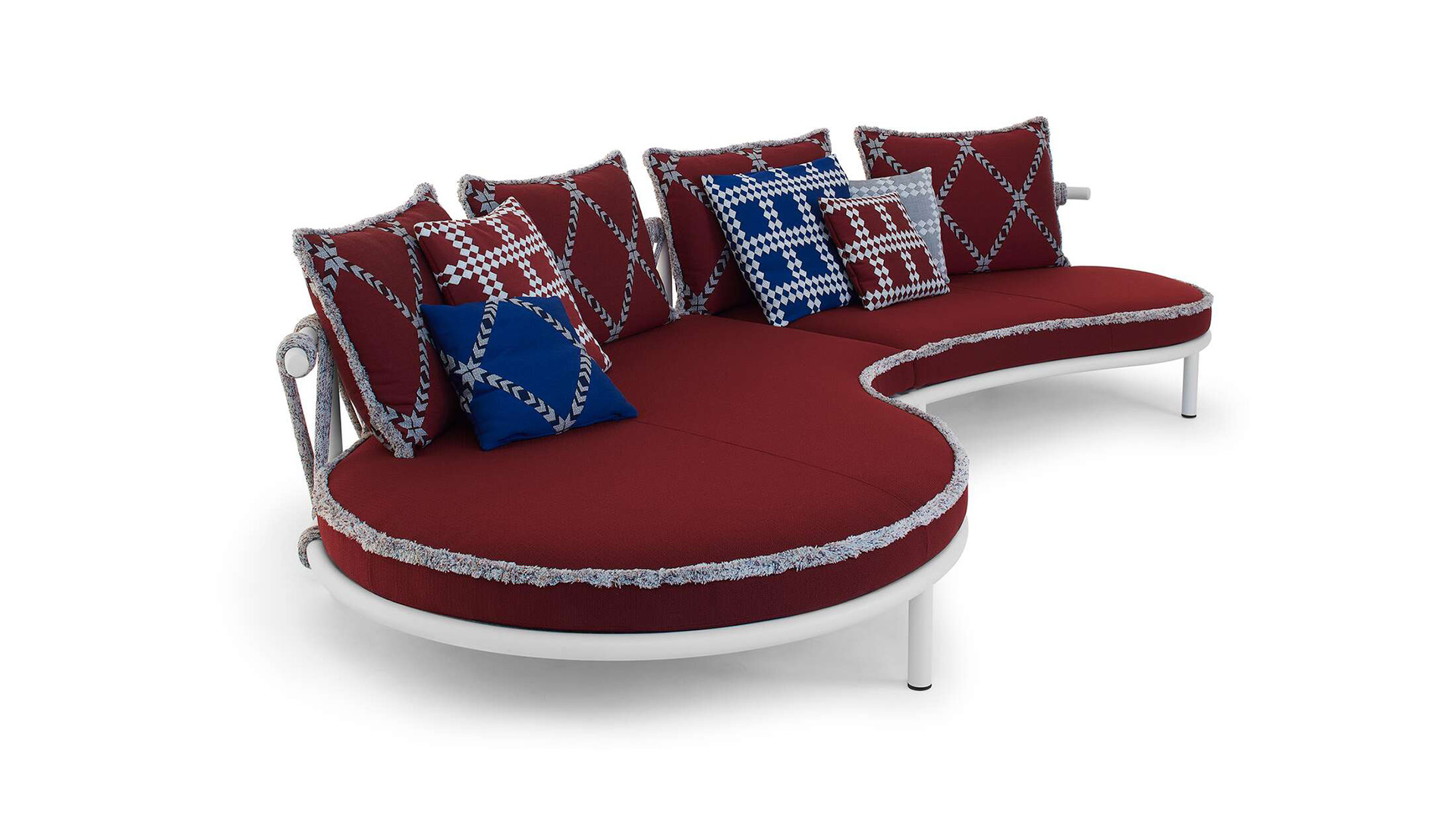 Patricia Urquiola interpreta el placer de vivir al aire libre con una colección de exteriores de diseño lúdico ; repleta de formas suaves y curvas, adopta un enfoque consciente del medio ambiente mediante el uso de materiales circulares e innovadores.